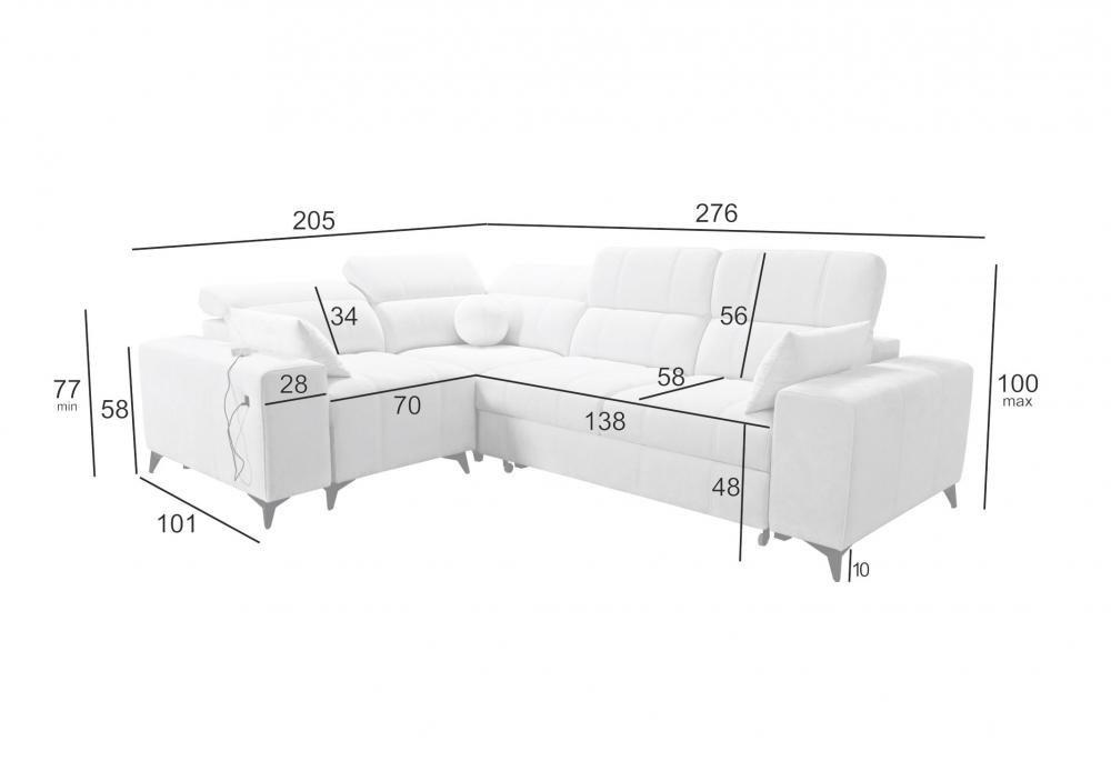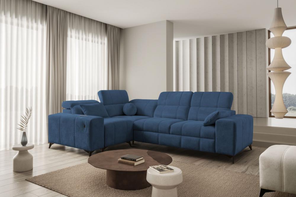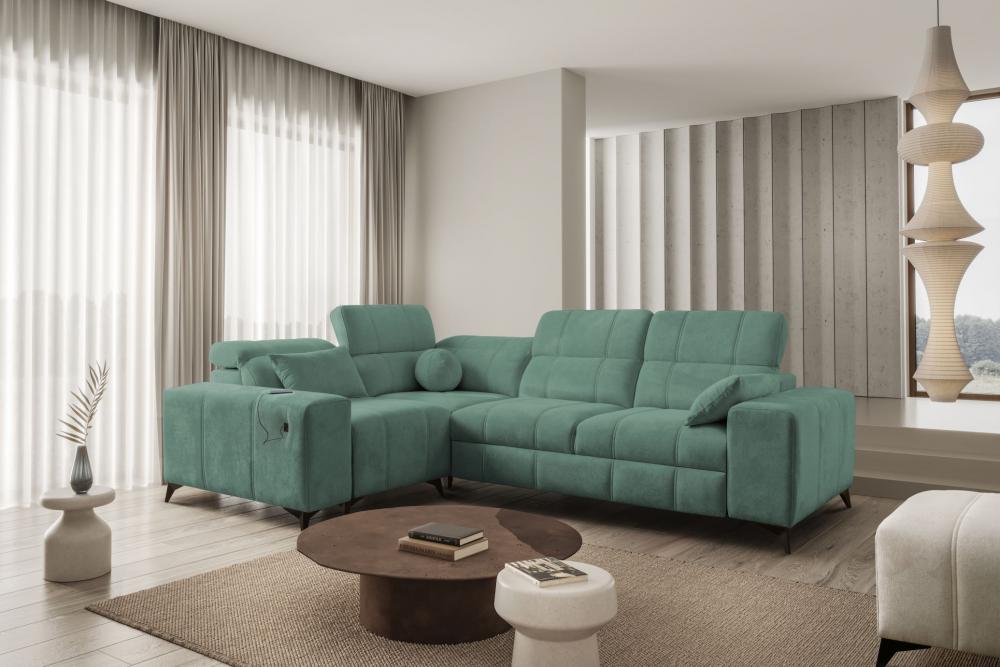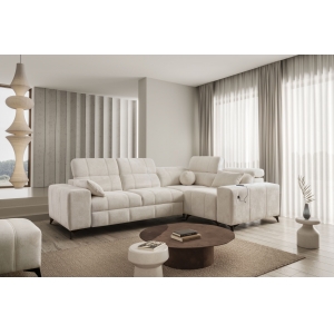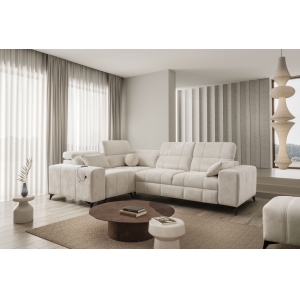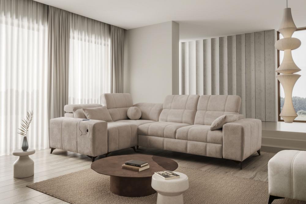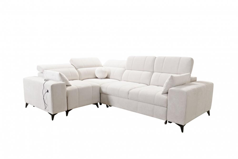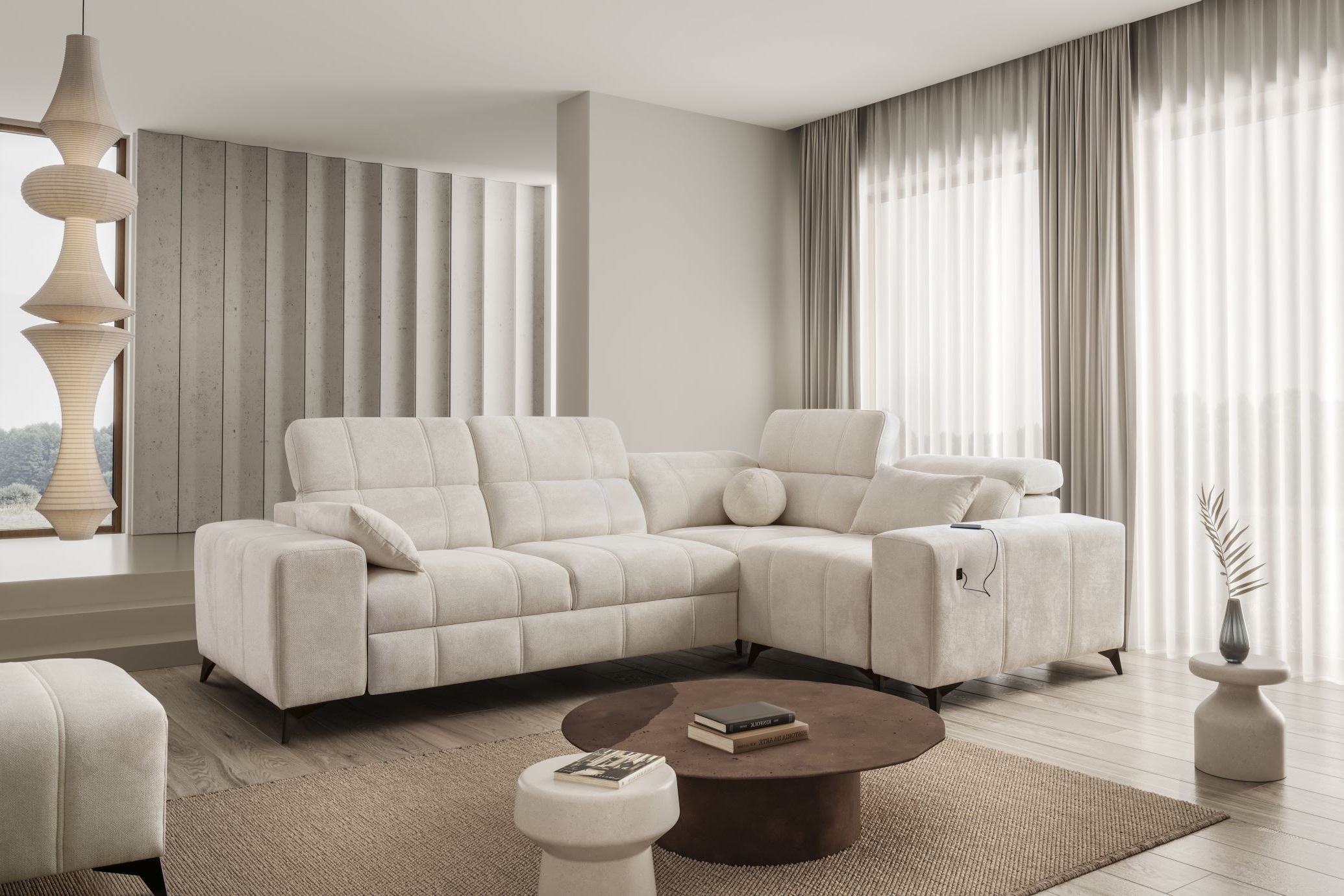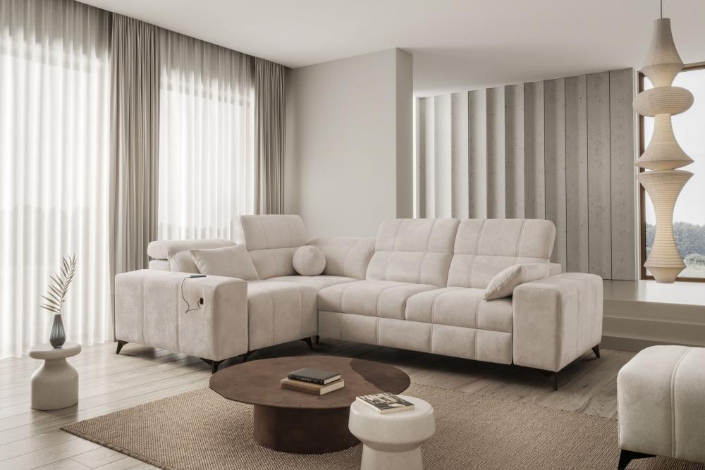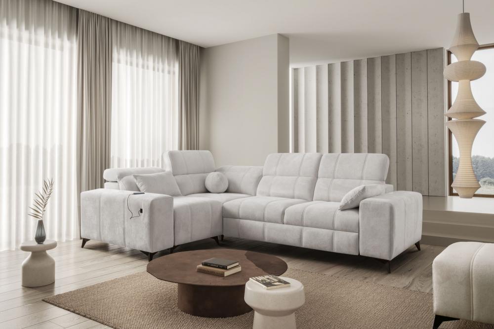 Entdecken Sie das elegante und moderne Ecksofa DAFNE, das höchsten Komfort und Stil vereint. Es verfügt über verstellbare Kopfstützen, einen praktischen Bettkasten und eine Schlaffunktion für zusätzlichen Komfort. Der integrierte USB-Anschluss ermöglicht einfaches Laden von Geräten. Die feinen Ziernähte und die schönen Dekokissen unterstreichen den luxuriösen Charakter des Sofas. Wählen Sie aus verschiedenen Stoffen, Farben und Fußvarianten, um das Sofa perfekt an Ihre Wünsche anzupassen.