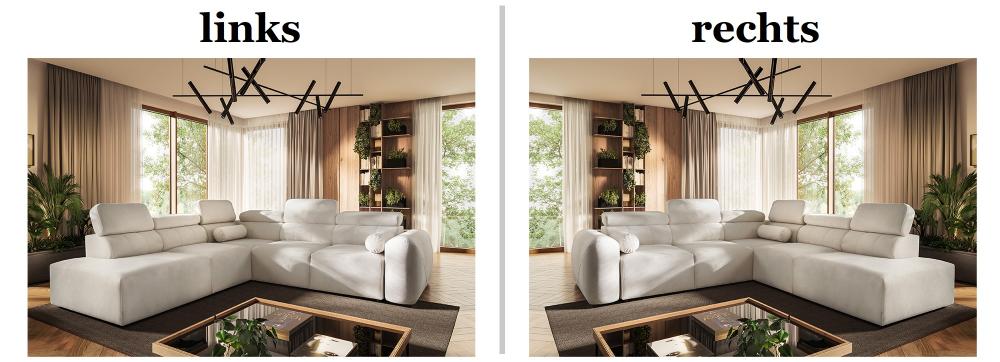 Im ersten Schritt wählen Sie bitte die Anordnung des Ecksofas, die Ihnen zusagt. Im zweiten Schritt wählen Sie den Stoff für Ihr neues Sofa und die Zierkissen.